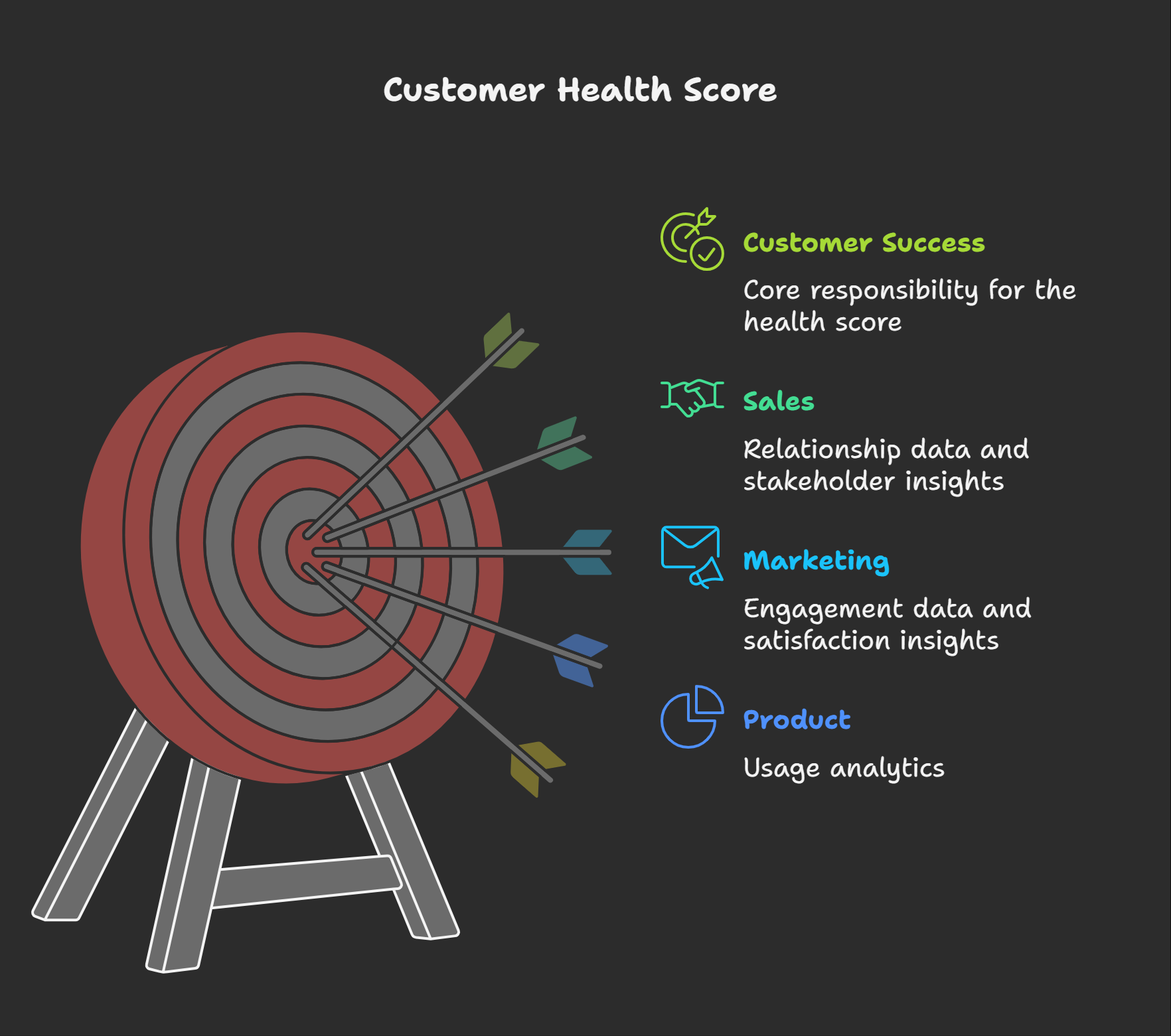 - Customer success owns the health score and ongoing optimization, but the score's effectiveness depends on data quality and insights from all teams.